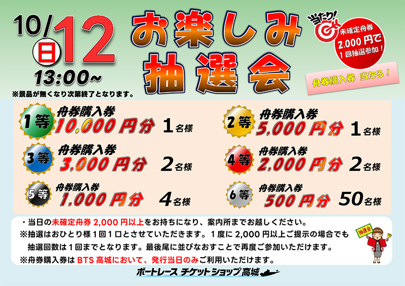 )に舟券購入券が当たる抽選会を実施いたします。この機会にぜひBTS高城へご来場ください。