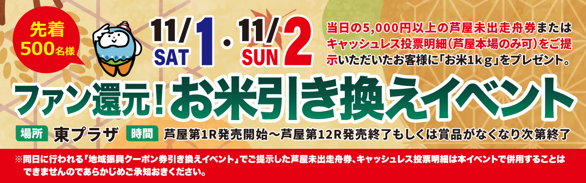 ※11/1(土)、11/2(日)に行われる「ファン還元!お米引き換えイベント」でご提示した芦屋未出走舟券またはキャッシュレス投票明細は本イベントで併用することはできませんので、あらかじめご承知おきください。