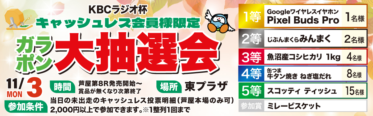 【内容】当日の未出走のキャッシュレス投票明細(芦屋本場のみ可)2,000円以上で参加できます。