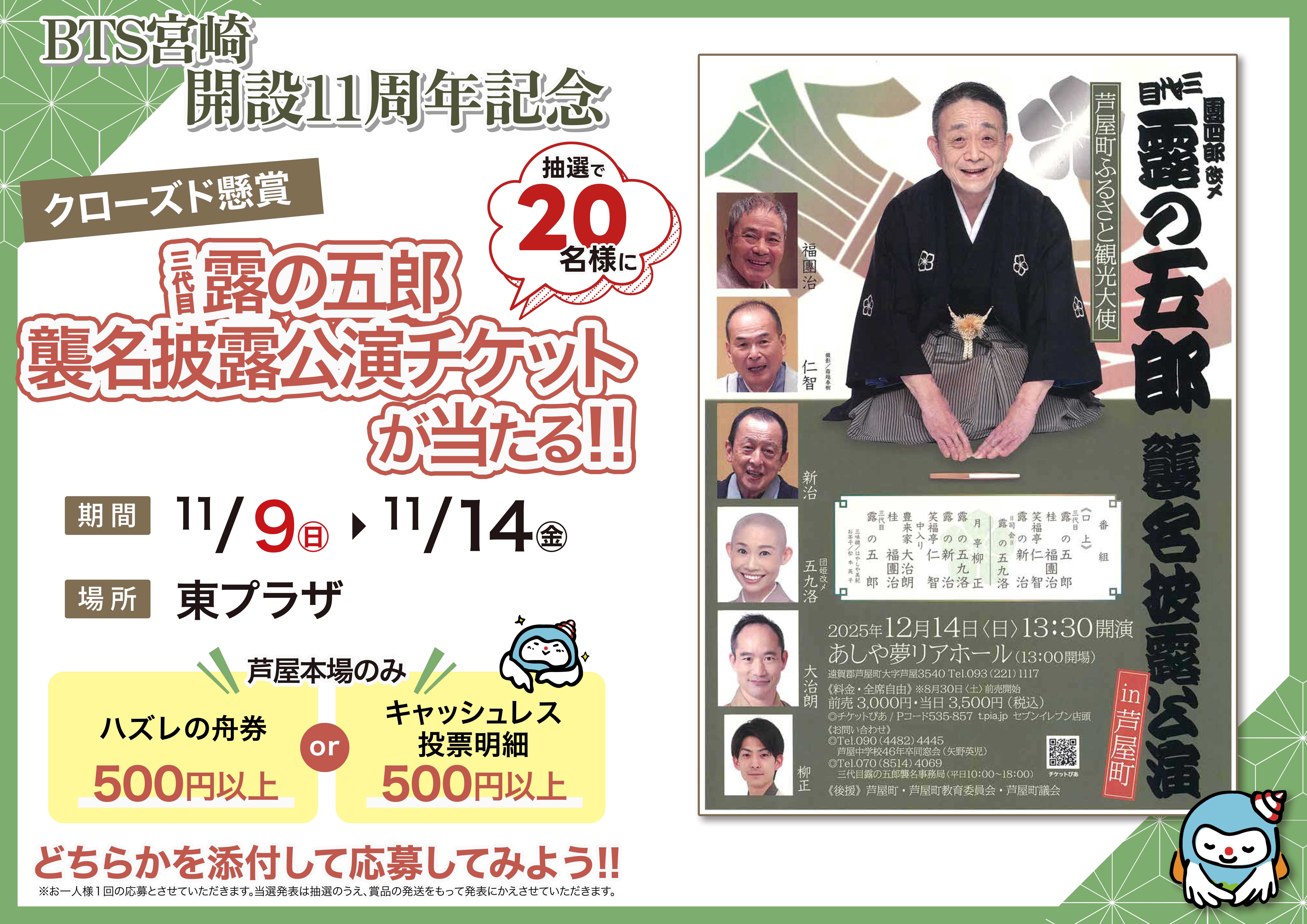 ◆芦屋町ふるさと観光大使 三代目露の五郎襲名披露公演チケットが抽選で20名様に当たる!クローズド懸賞