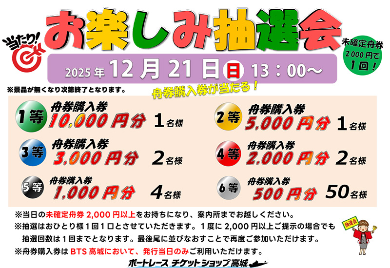 ) に舟券購入券が当たる抽選会を実施いたします。この機会にぜひBTS高城へご来場ください。