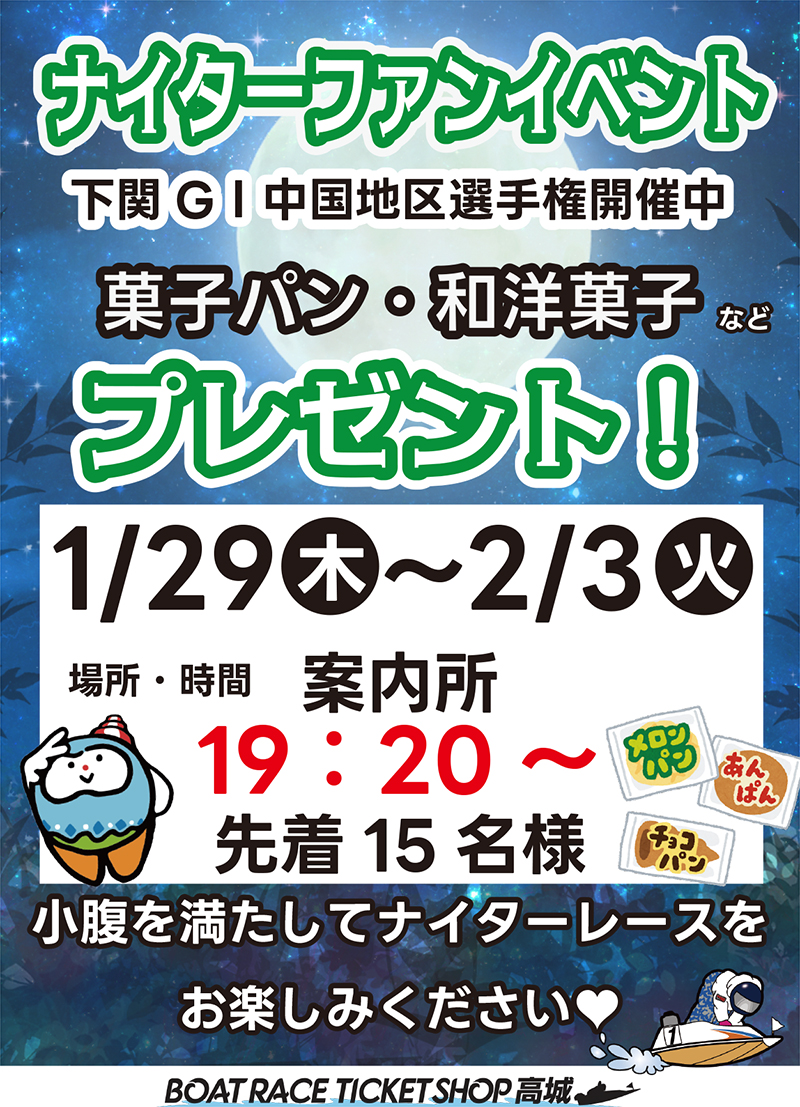 BTS高城では、1月29日(木)から2月3日(火)までの6日間、ナイターファンイベントとして、菓子パンやお菓子のプレゼントを実施します。この機会にぜひBTS高城へご来場ください。