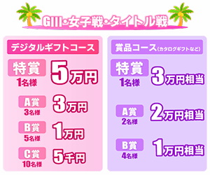 専用の応募フォームにエントリーのうえ、対象レースに10,000円以上電話投票していただいた方の中から、抽選でPayPayや楽天ポイントなどに交換できるデジタルギフトorカタログギフトをプレゼントいたします。