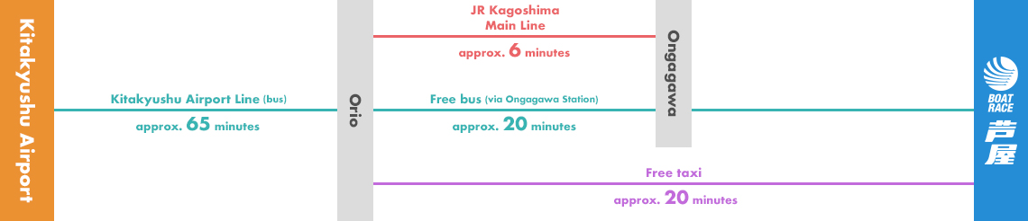 A free taxi service runs from Kurosaki Station, Orio Station, and Ongagawa Station to the Boat Race Stadium. A free bus runs from Orio Station, Koga Station, Nogata Station, and Tobata Station to the Boat Race Stadium.