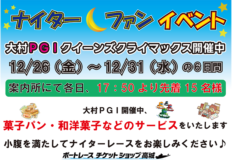 BTS高城では、12月26日(金)から31日(水)までの6日間、ナイターファンイベントとして、菓子パンやお菓子のプレゼントを実施します。この機会にぜひBTS高城へご来場ください。