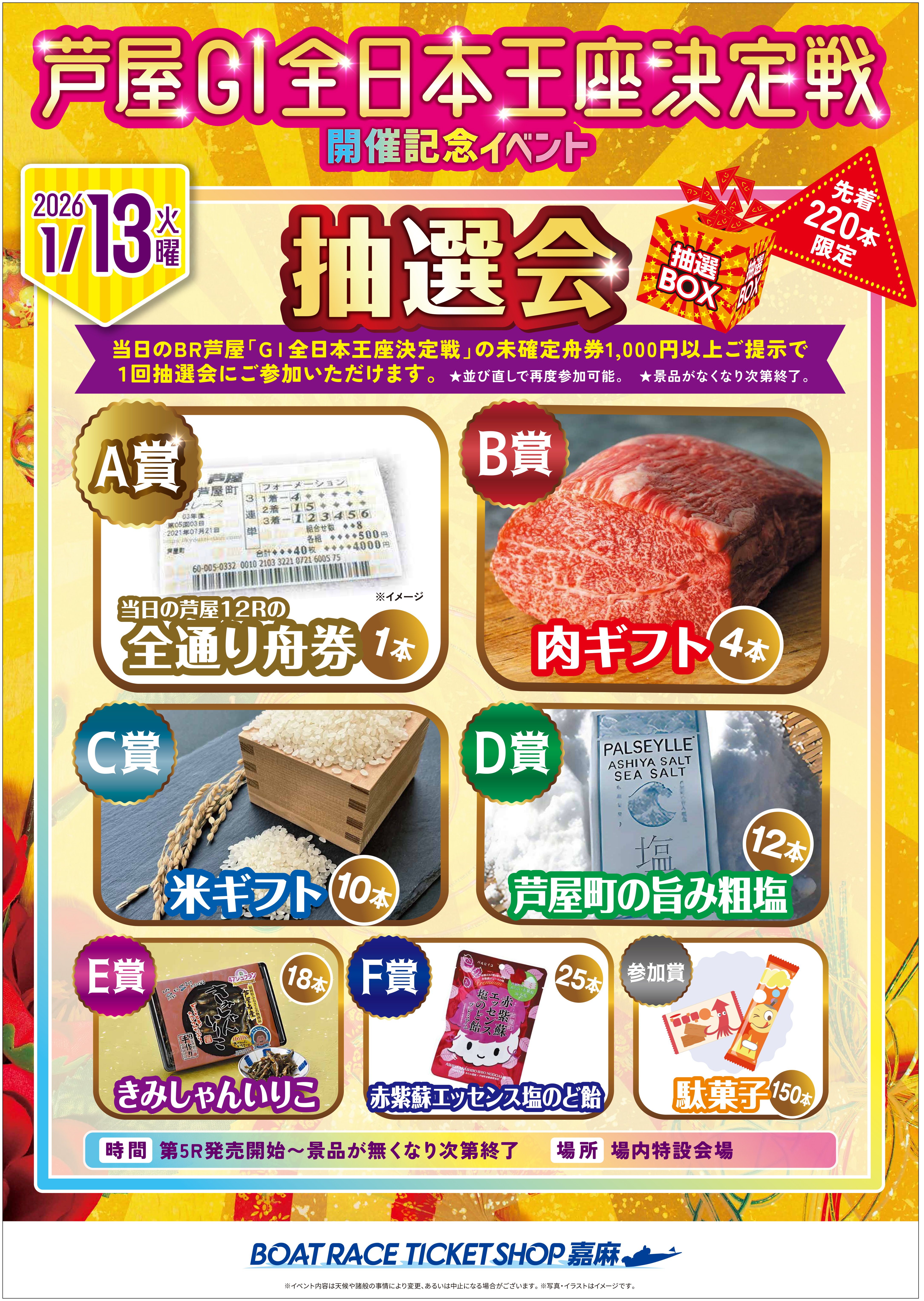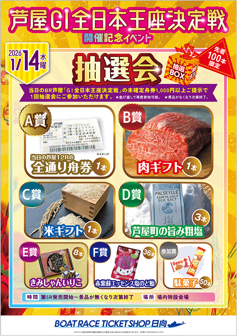 BTS日向では、芦屋GⅠ全日本王座決定戦開催にあわせてイベントを実施します。この機会にぜひご来場ください。