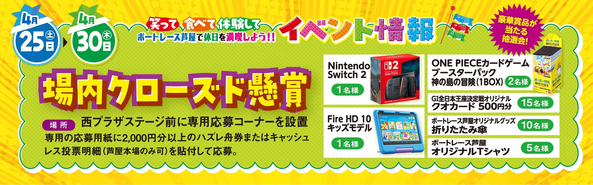 【内容】当日の未出走舟券または未出走のキャッシュレス投票明細(芦屋本場のみ可)2,000円以上で参加できます。