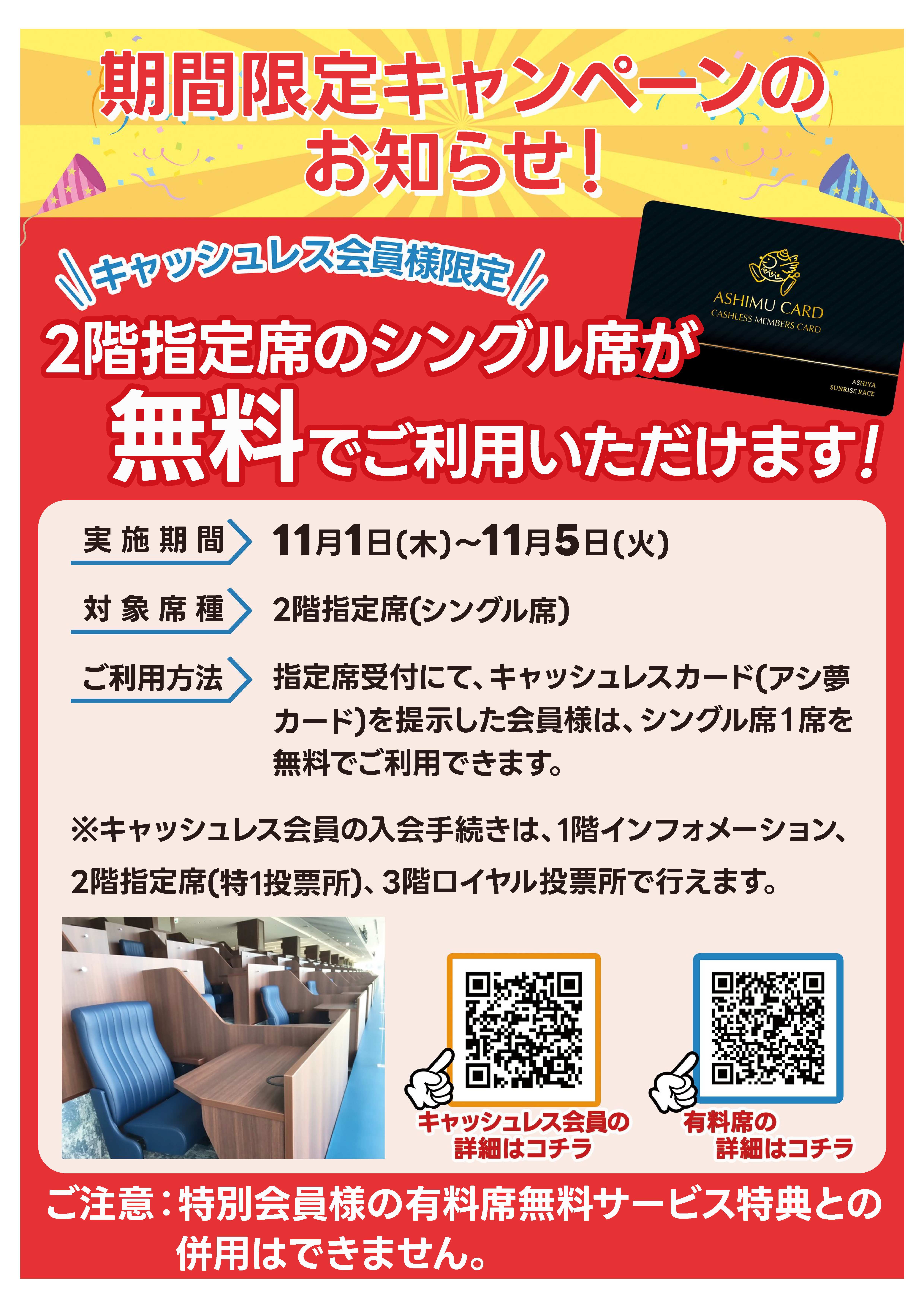11月1日(土)から11月5日(水)の期間中、キャッシュレス(ASHIMUカード)会員様を対象として、2階指定席(シングル席)が無料で利用できます。
