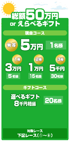 事前に芦屋サンライズメンバーズにご登録のうえ、①~⑩の対象レースを電話投票で、各節合計10,000円以上舟券を購入された方を対象に、各対象レース抽選で現金または選べるギフトがあたるプレゼントキャンペーンを実施。