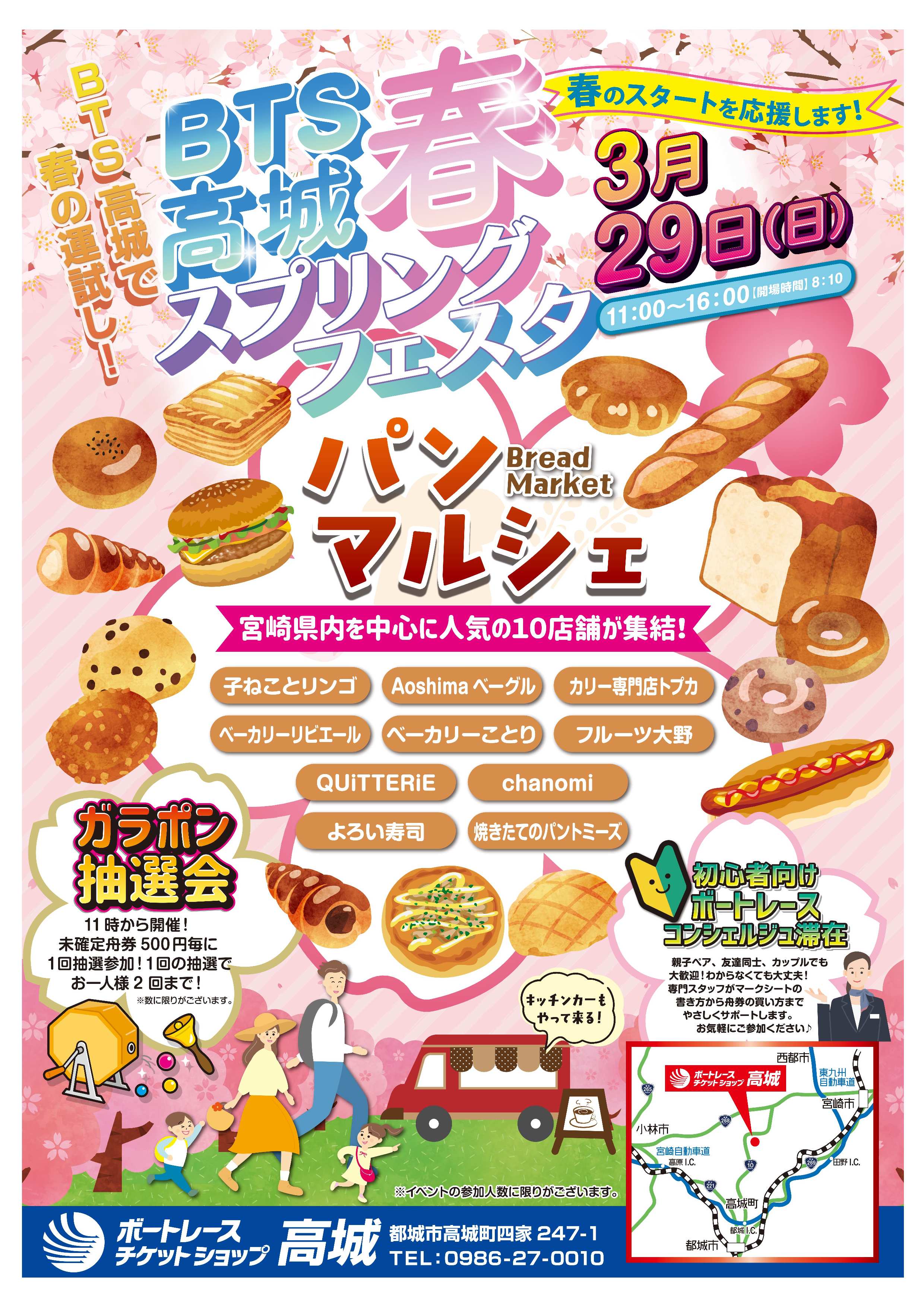 BTS高城では、スプリングフェスタを開催します。パンマルシェやガラポン抽選会などを行いますので、この機会にぜひBTS高城へご来場ください。